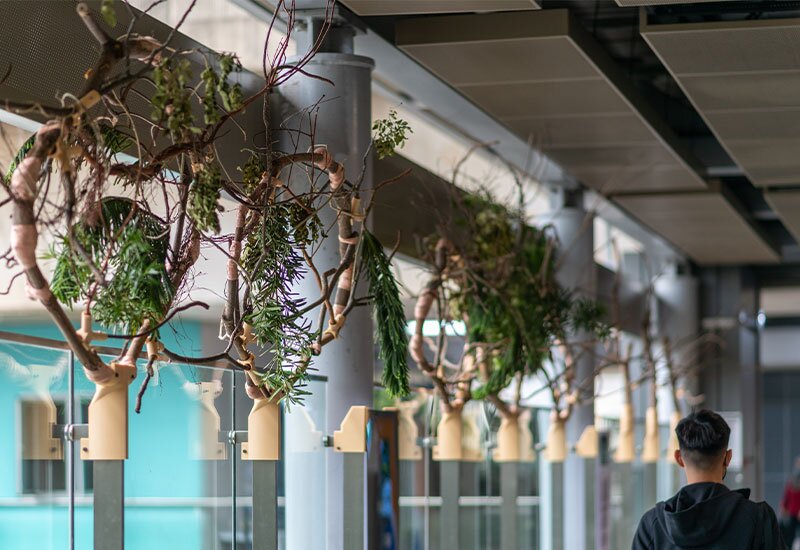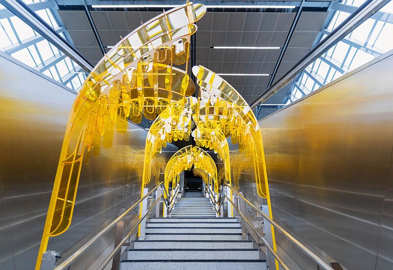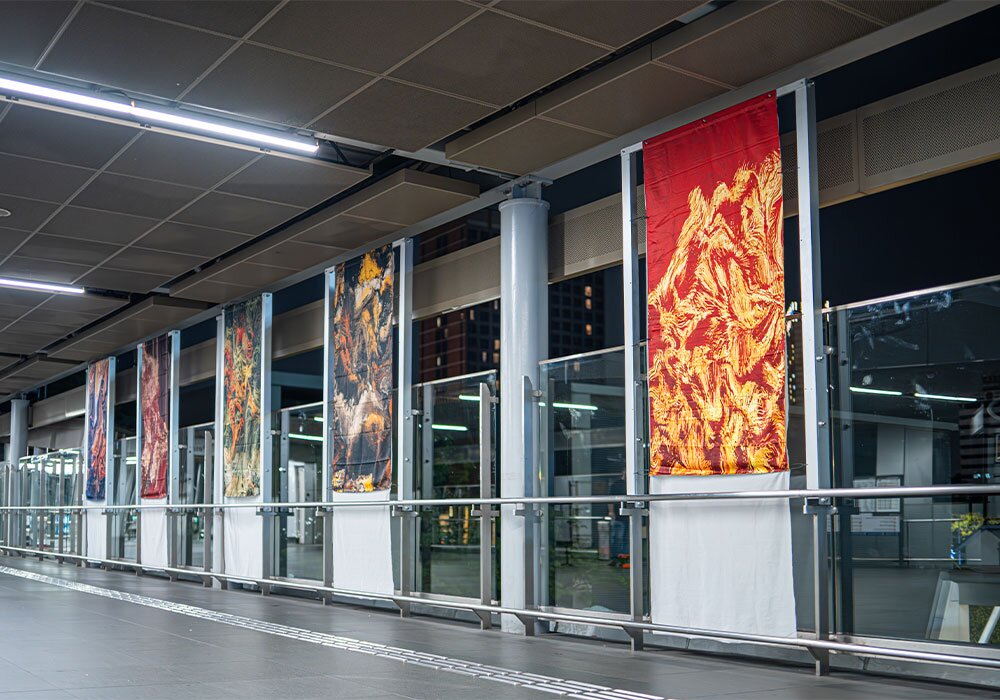 Kain-kain yang beralun, seolah-olah terhenti di tengah gerakan, tergantung di jambatan dalam Stesen MRT Pasar Seni. Ia kelihatan melayang antara masa lalu dan masa kini, mengisyaratkan warisan yang telah bertahan sepanjang zaman – namun dihidupkan semula dengan cara yang segar dan moden.