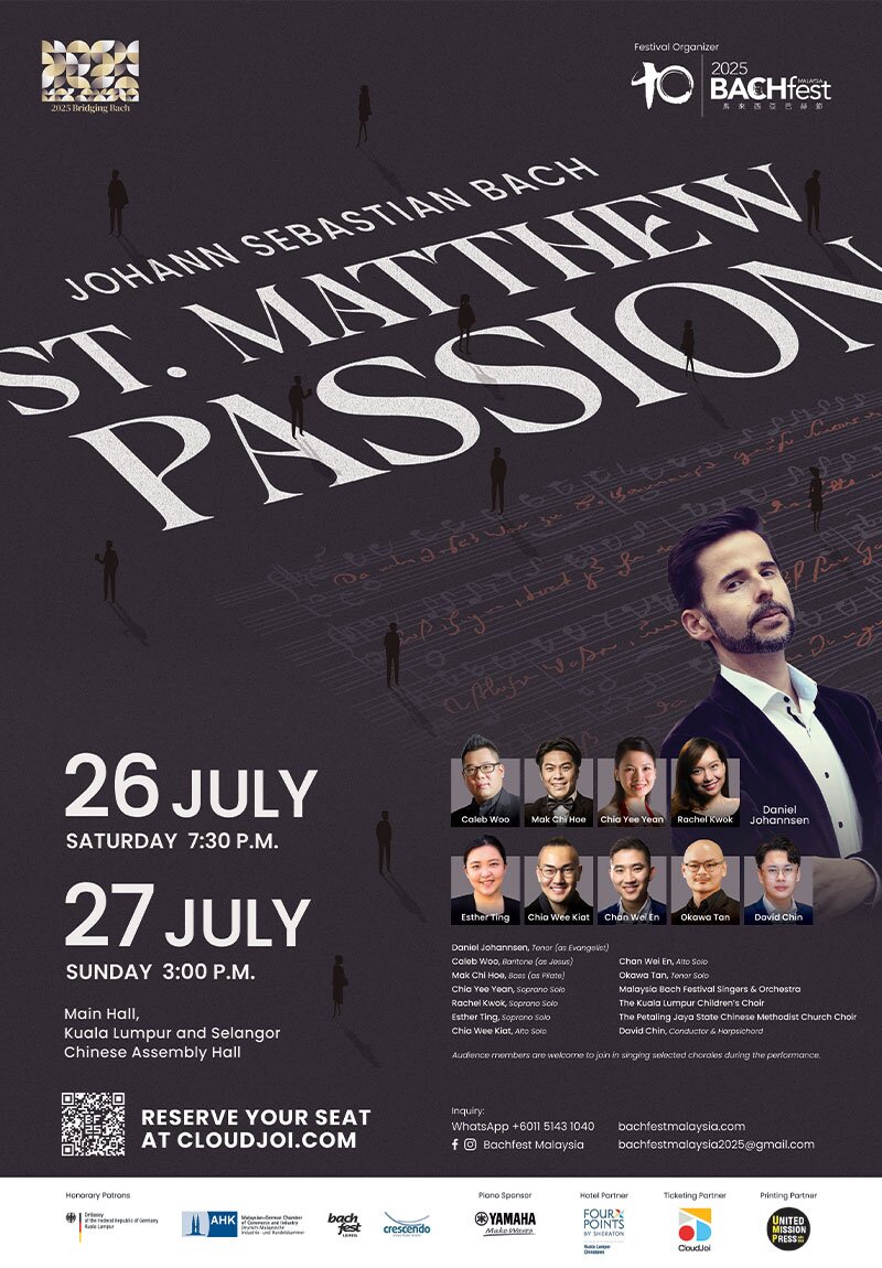 Antara persembahan utama dalam festival ini adalah karya agung St. Matthew Passion oleh Bach, yang akan dipersembahkan dalam dua sesi. Karya monumental ini memerlukan ansambel besar yang merangkumi korus berganda, orkestra berganda dan ramai penyanyi solo. Tenor terkenal dari Austria, Daniel Johannsen, akan memainkan peranan sebagai “Evangelist”, menyampaikan naratif kisah Passion bersama-sama Malaysia Bach Festival Singers and Orchestra.