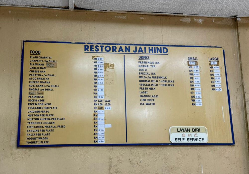 Harga di Jai Hind masih kekal dan sangat berpatutan, sehingga ke hari ini. Satu hidangan untuk dua orang, Ini termasuk dua keping capati panas yang bulat, satu naan gebu, secawan teh masala, dua hidangan kambing cincang, satu peha ayam kari, dan satu pencuci mulut ras malai – dengan hanya RM25. Nilai sebegini sememangnya sukar untuk didapati di kebanyakan tempat makan di Kuala Lumpur pada masa kini.