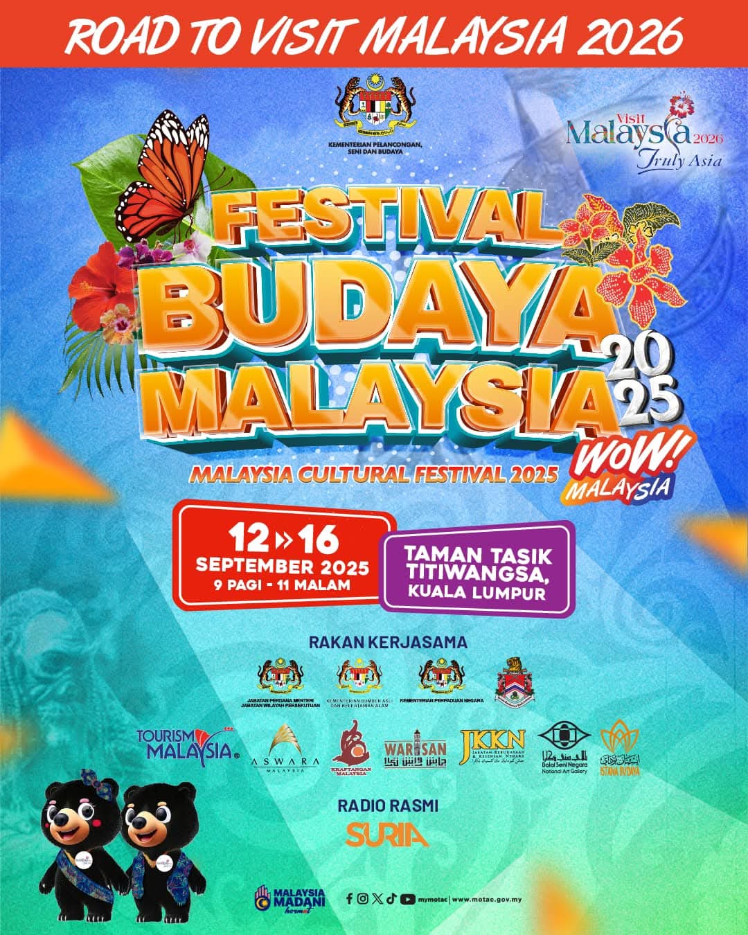 Buat julung kalinya, Kementerian Pelancongan, Seni dan Budaya (Motac) mempersembahkan Festival Budaya Malaysia 2025. Lebih 300,000 pengunjung dijangka menyertai 68 segmen aktiviti seni dan budaya dalam perayaan meriah yang meraikan kreativiti serta warisan Malaysia!
