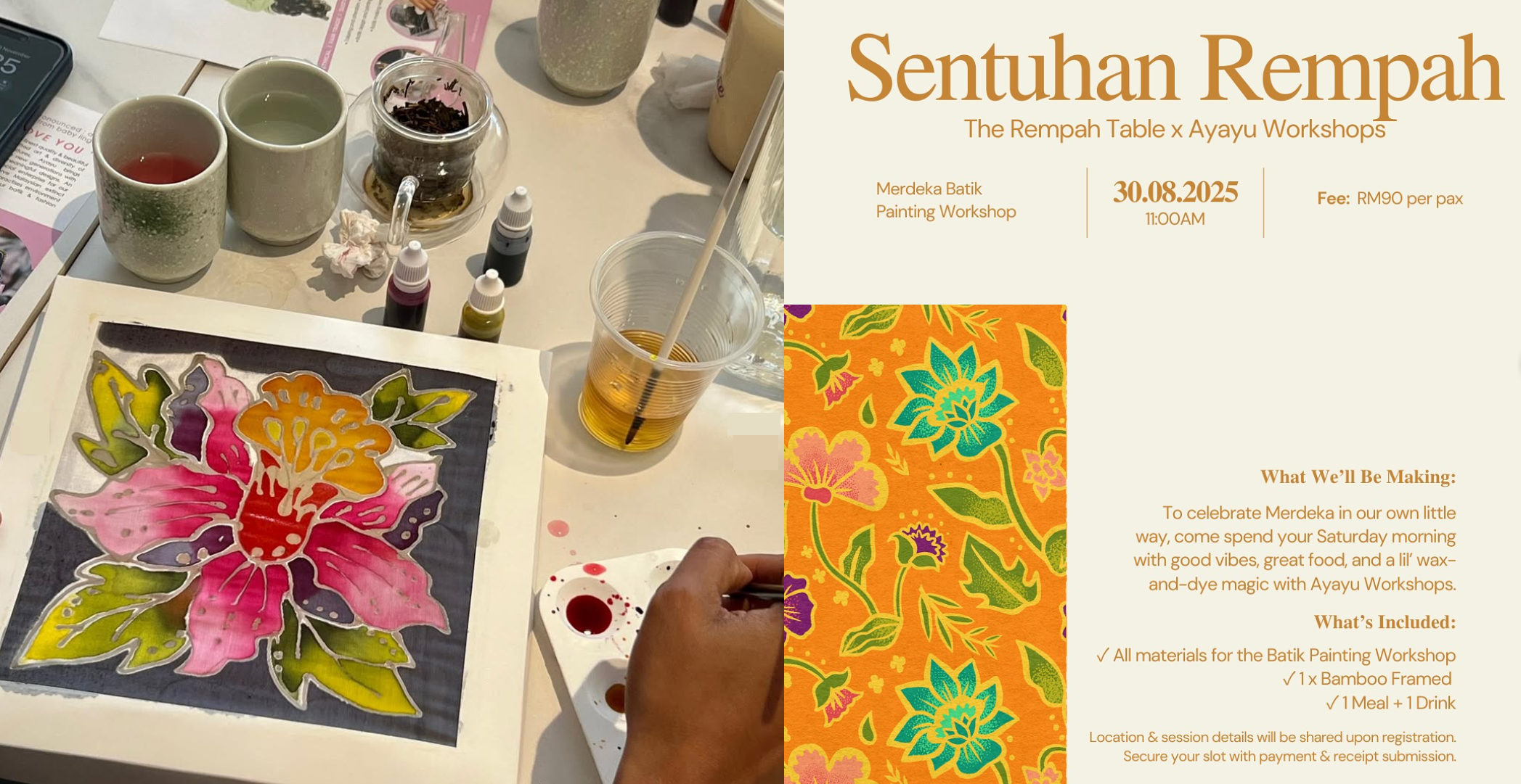 Raikan Hari Kebangsaan dengan pagi yang penuh kemeriahan, kreativiti dan suasana positif! Sentuhan Rempah, dengan gandingan Ayayu Workshops dalam sesi melukis batik secara interaktif – di mana anda boleh bersantai dengan lilin dan pewarna, serta menghidupkan budaya Malaysia.