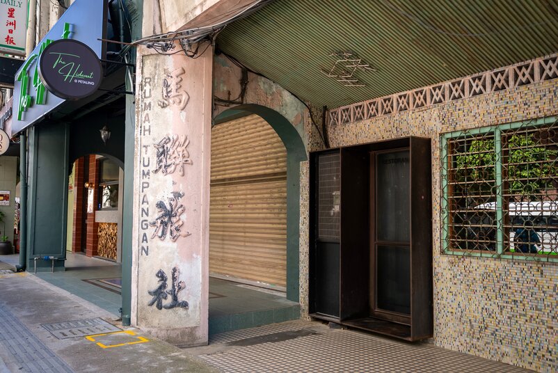 Papan tanda dalam bahasa Melayu yang dilukis dengan tangan di sebelah relief plaster Cina. Banyak relief seperti ini masih kekal di hadapan rumah kedai, walaupun perniagaan di situ sudah lama ditutup.