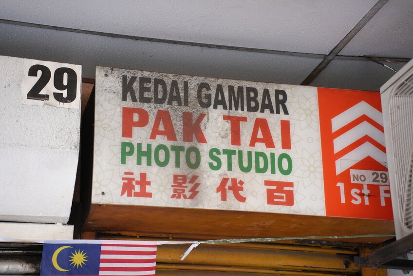 Papan tanda di Studio Foto Pak Tai adalah baharu, namun masih mengekalkan reka bentuk asalnya, dengan nama dalam tulisan Cina dipersembahkan dalam gaya modenis meishuzi (美术字).