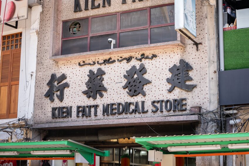 Kedai Perubatan Kien Fatt memaparkan papan tanda Jawi pada bahagian hadapan bangunannya.