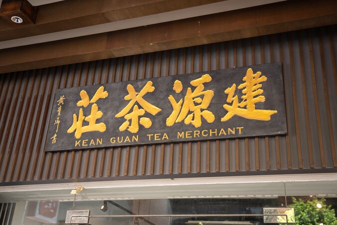 Papan kayu yang tergantung di atas pintu masuk Kean Guan Tea Merchants dihasilkan oleh Huang Shi Qing (黄实卿), seorang tukang yang terkenal dan mahir dalam seni kaligrafi, ukiran dan pembuatan papan tanda.