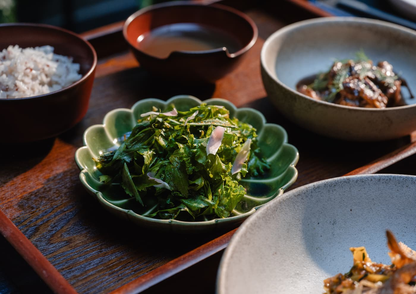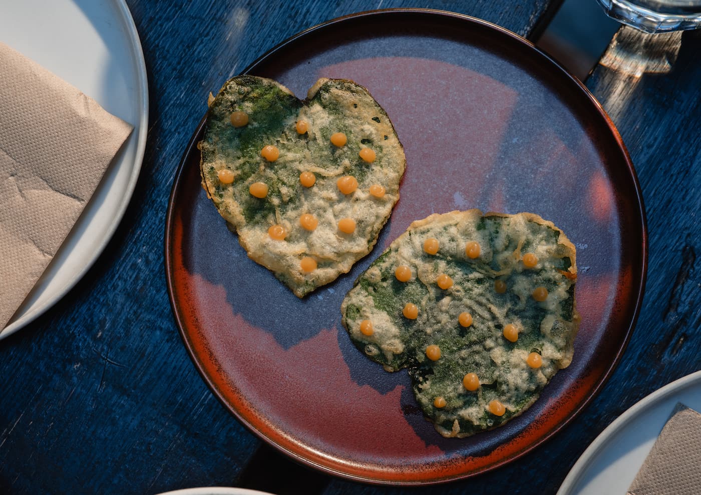 Across the menu, dishes are built on this principle. Familiar elements appear, but not always in expected forms. Tempura kadok brings together wild pepper leaves and mackerel paste, echoing the texture of otak-otak while introducing a different structure. Ulam, seafood and herbs are layered with sauces or purées that draw from regional references, sometimes revealing themselves only gradually.