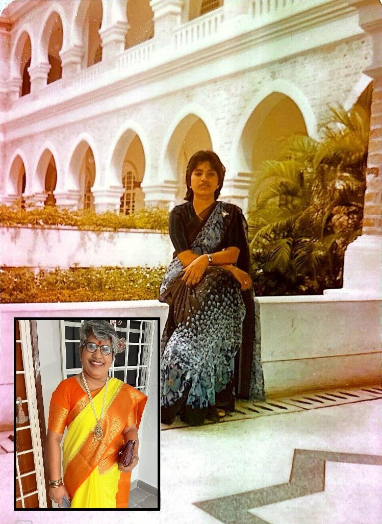 Saras Manikam taking a breather while at work in BSAS in the 1990s, interpreting court proceedings and witnessing decades of legal history unfold within its walls. Inset: Saras, today, is proud of her tenure working in the historic building. – Photos: Saras Manikam
