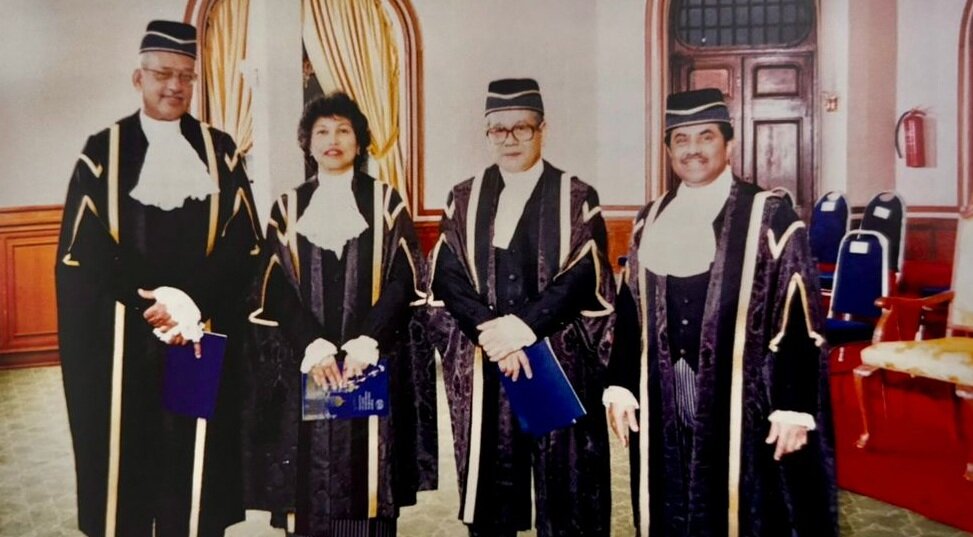 Tan Sri George (far right) at the 1984 Judges’ Conference (Persidangan Hakim-Hakim) inside BSAS, a witness to both legal tradition and the building’s living history. – Photo: Tan Sri Dato’ V.C. George personal collection. Below: Some of the first set of Court of Appeal Judges: (From left): Tan Sri VC George, Tan Sri Siti Norma Yaakob, Dato Dr Zakaria Mohamed Yatim and Dato Shaik Daud Mohamed Ismail. The Court of Appeal of Malaysia was formally established in 1994 while the courts were still in BSAS.