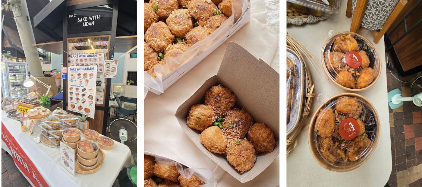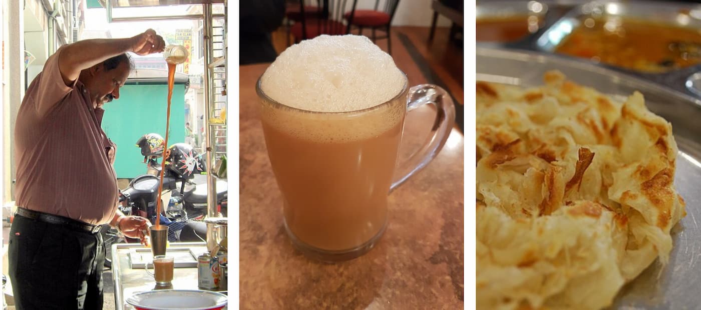 Teh tarik is ordered alongside roti canai, the two arriving in quick succession at the table. Bergedil sits among other items on a mixed plate, selected without much pause. Apam Balik is folded into paper and eaten while walking. Putu Bambu is lifted from the tray and eaten warm, often standing nearby.
