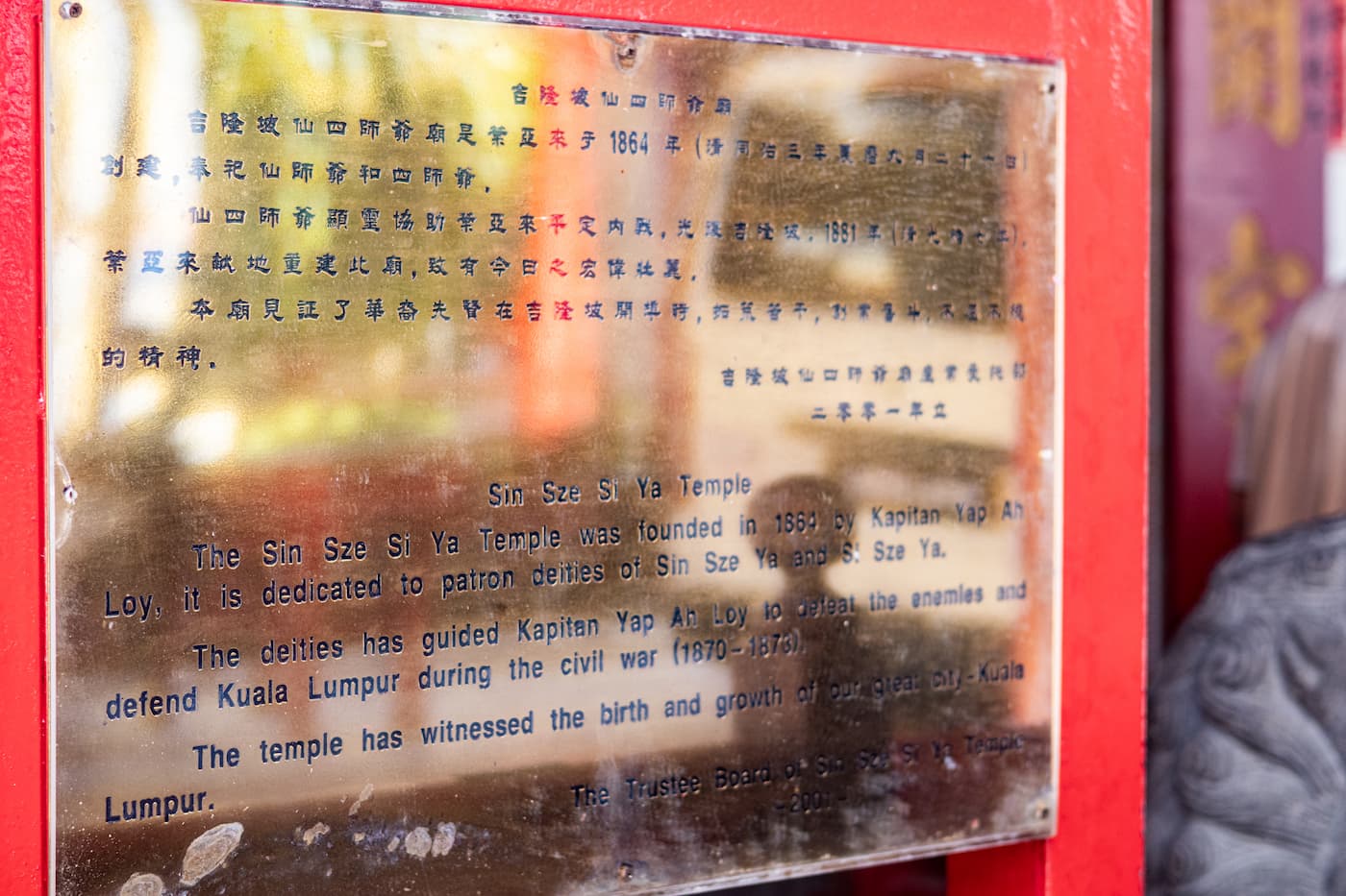 The temple is devoted to two deities; Sin Sze Ya and Si Sze Ya, spirits believed to have guided Yap Ah Loy to victory during the conflict. Sin Sze Ya, in particular, is thought to be the spirit of Seng Meng Lee, a former Chinese Kapitan who was brutally killed in an ambush. It is said that when Kapitan Lee was beheaded, white blood flowed from his neck, marking him as a saint-like figure.